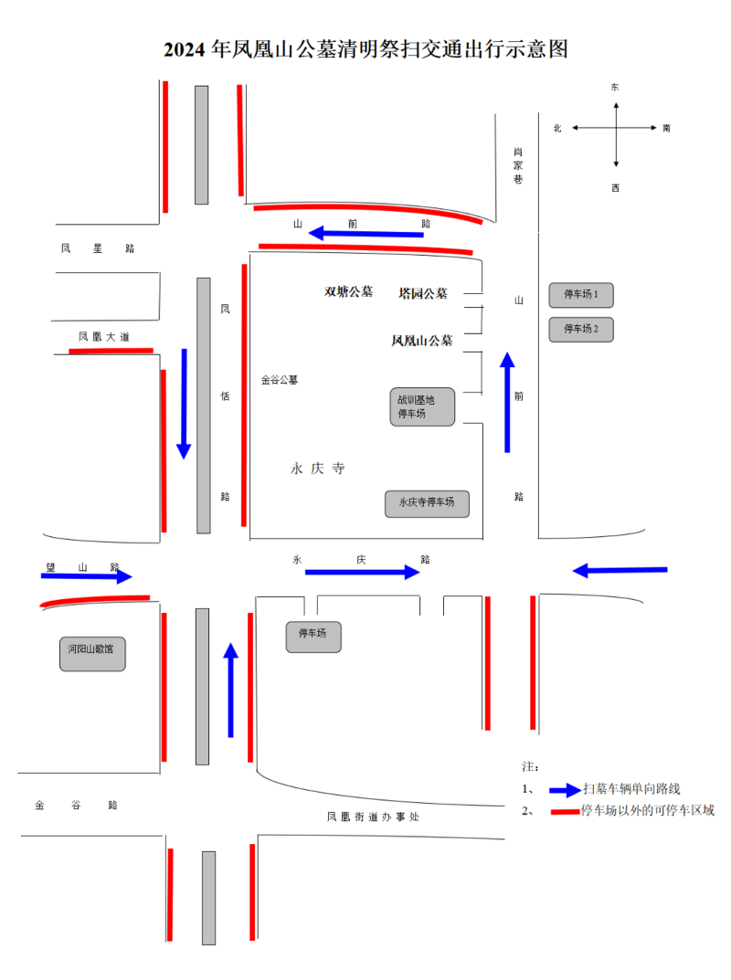 为缓解道路交通压力、减少拥堵,提倡市民采用绿色低碳的出行方式。同时,清明期间我镇将对凤凰山墓区周边实行交通管制(4月3日-4月4日实行单向通行,其余时间段视交通情况进行管制)。机动车从凤恬路永庆路口进,通过山前路单向绕行,由凤恬路环山公路出口驶出。