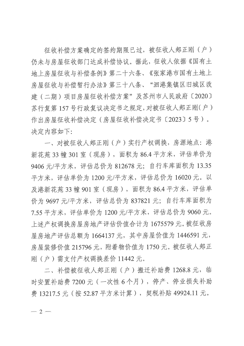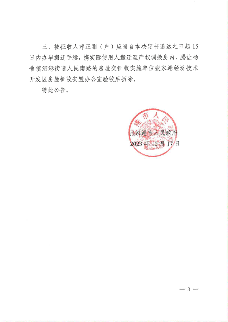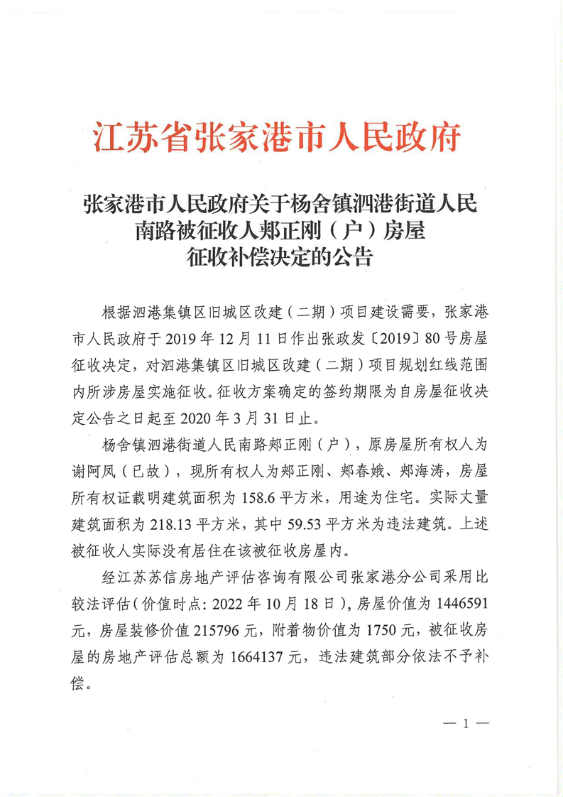张家港市人民政府关于杨舍镇泗港街道人民南路被征收人郏正刚(户)房屋征收补偿决定的公告