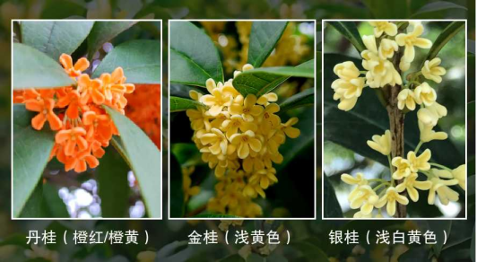 四季桂:四季开花,花色较淡,为乳黄色至柠檬黄色,花香不及银桂、金桂、丹桂浓郁。