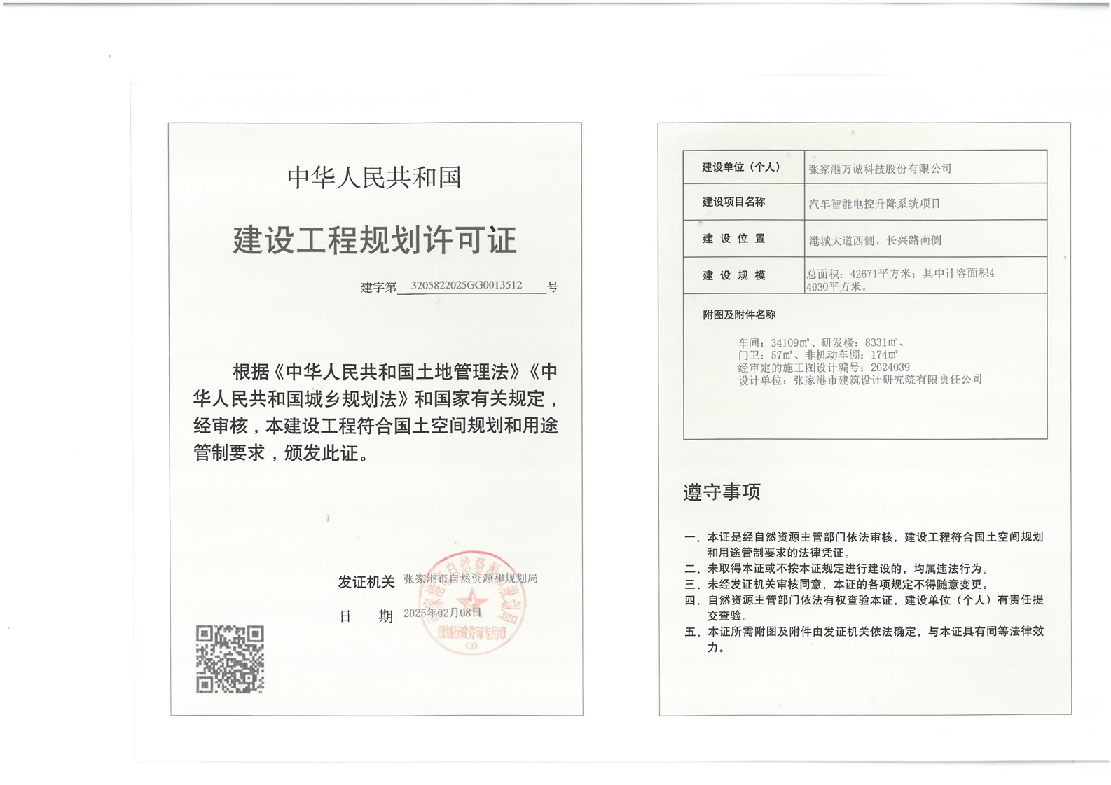 建设工程规划许可证:张家港万诚科技股份有限公司汽车智能电控升降系统项目