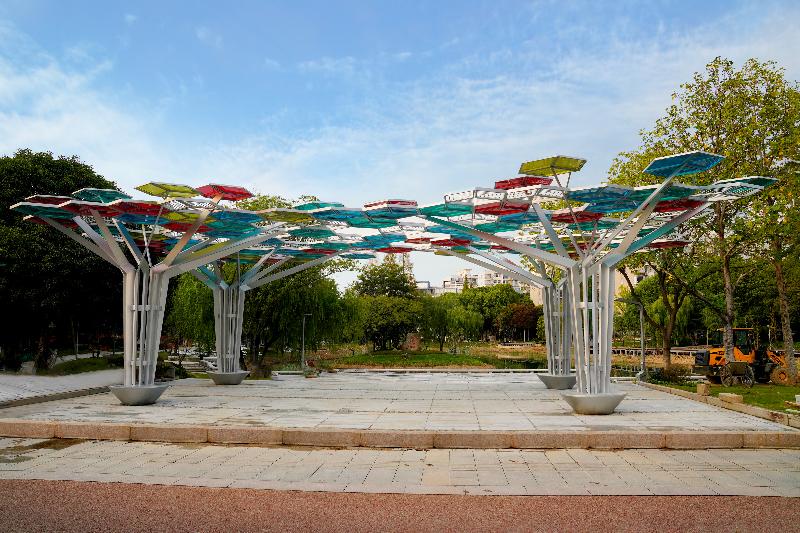 “光伏景观标志”项目:利用技术创新等手段,打造特色化、亮点化公园景观。在前溪小游园“口袋公园”项目中,运用“光伏景观标志”设计技术,打造拥有充电、免费WIFI、太阳能照明的多功能多彩景观标志物。同时,将彩色光伏玻璃与景观装置相结合,打破传统光伏玻璃颜色单一,与景观装置结合效果差的问题,彩色光伏玻璃结合景观构筑物的设计为我市首次引入,不仅节能减耗,降温隔热,更促进了园林景观的技术革新。